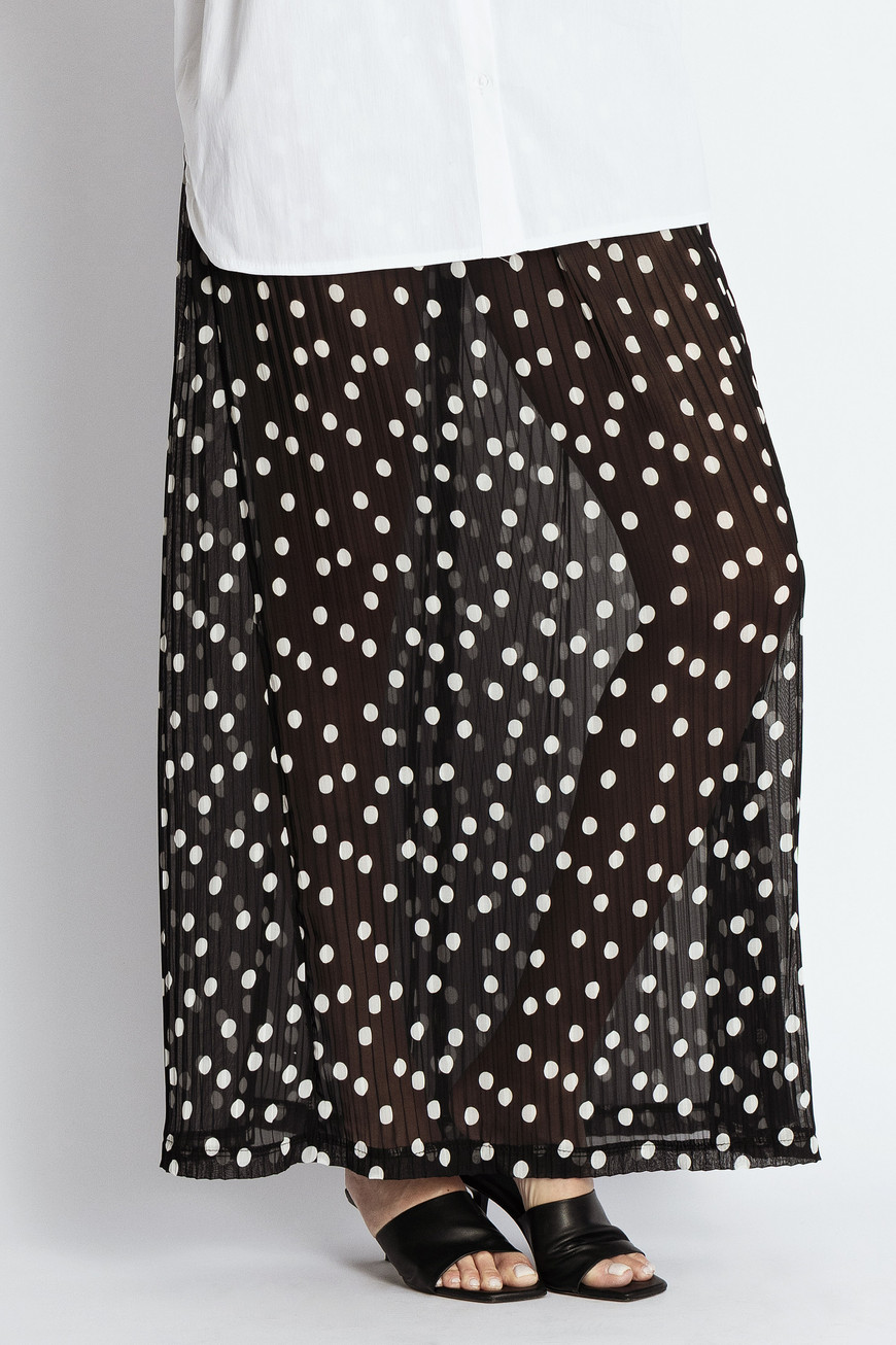 Fustă lungă, de culoare neagră, confecționată din material ușor transparent cu buline. Are talie elastică pentru o fixare comodă și o croială dreaptă, lejeră, care cade natural pe corp.