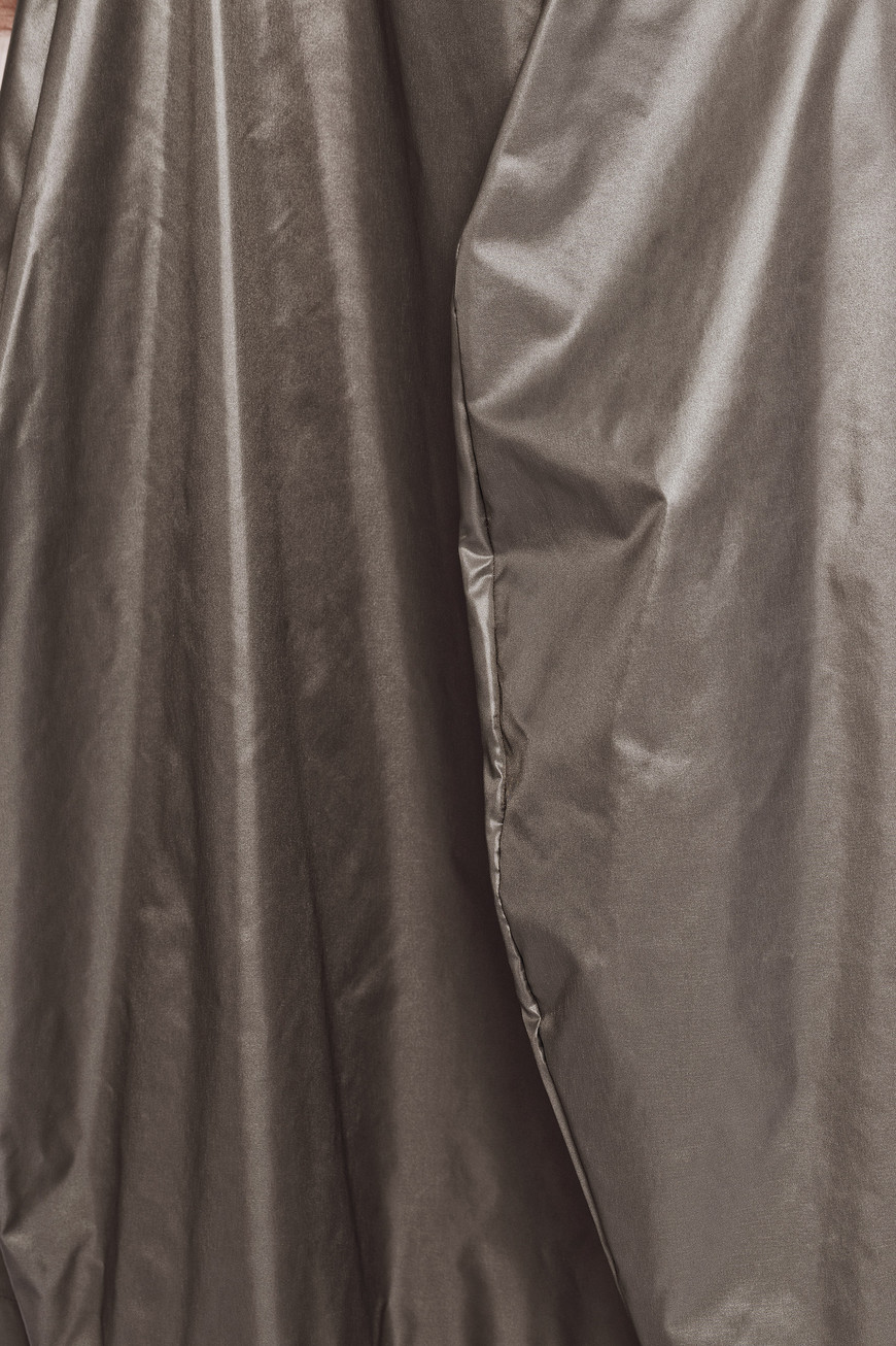 Fustă midi cu croială tip balon, realizată din material cu efect metalic discret. Are detalii de cusături care accentuează forma bufantă. Textura lejeră permite volumului să se așeze natural, păstrând un aspect modern.
