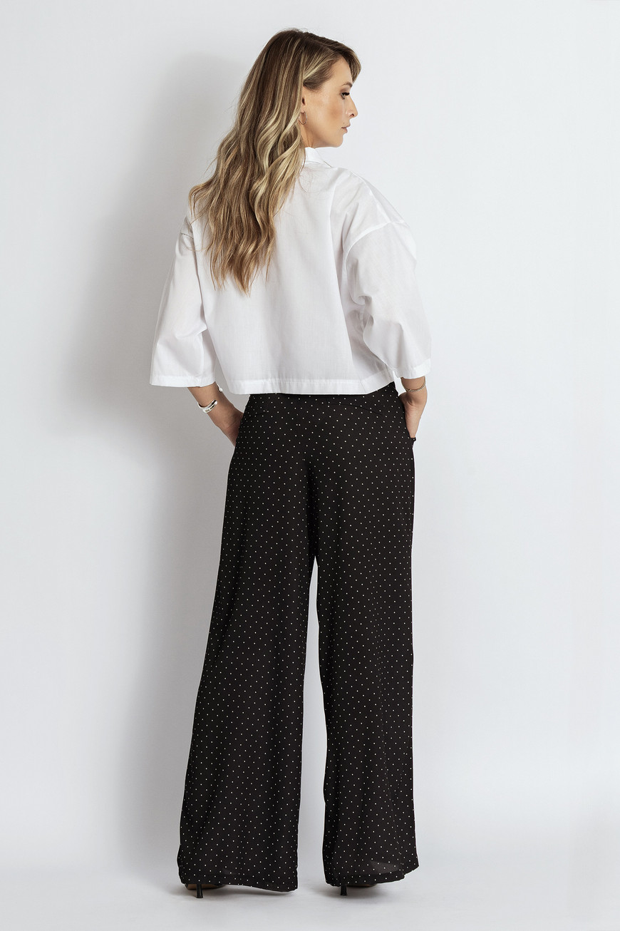 Pantaloni cu croial ă dreaptă, talie joasă și imprimeu cu buline pe întreaga suprafață. Sunt prevăzuți cu pense în față pentru un plus de structură și buzunare laterale practice.