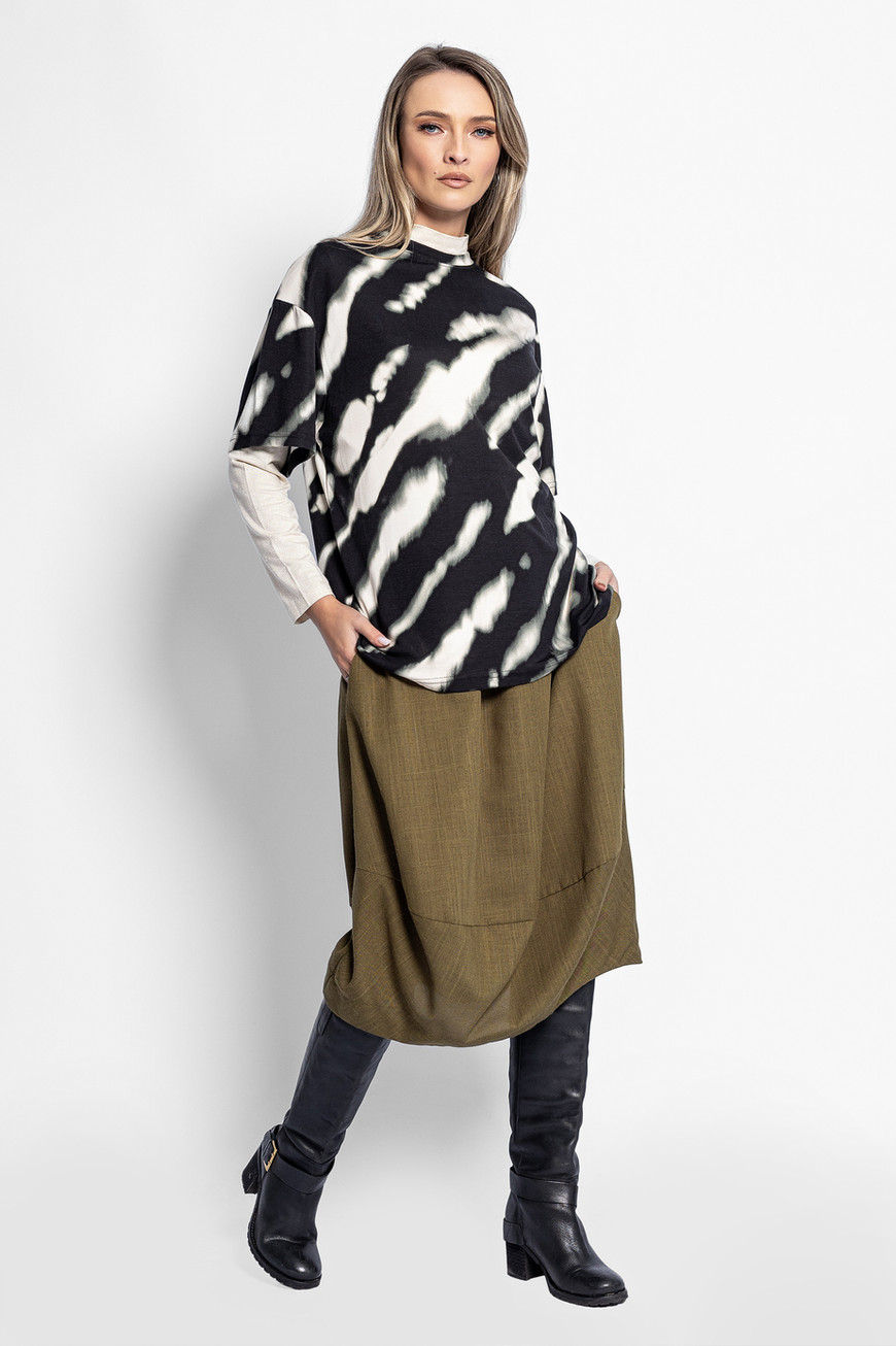 Fustă midi balloon, cu talie elastică. Confecționată din material ușor, cu croială lejeră și volum delicat.